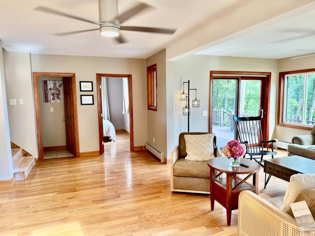 The Charlemont Chalet is designed for those who crave serenity, mountain air, and a touch of rustic luxury. Here's a quick summary of what makes this place so special. Secluded on 15 private acres, halfway up a mountain in Charlemont but close to nature and fun activities. The chalet is spacious, stylish and designed for your comfort. Less than 2 miles to Zoar's Outdoor and close to Berkshire East, Shelburn Falls, North Adams (Mass Moca) west on the Mohawk Trail or Greenfield on the east. This Charlemont Chalet is perfectly sited on 15 acres offering complete privacy with stunning mountain views. The open kitchen is the heart of the retreat and has all top of the line stainless steel appliances. You will enjoy using the oven, the microwave, the oversized refrigerator, the luxurious cherry cabinets and oh so much space to create your culinary experience. The bar seating invites conversations, convenience while having a quick bite. For those whose work always follows, there's a dedicated office area tucked away on the main floor so while you work you can enjoy the view and check out the festivities on the deck or at the firepit. There are 2 ensuite bedrooms on the second floor. The master is spacious and has a sitting area, and a large walk in closet that spans the entire width of the chalet. There's a third bedroom on the main level with a full size bed and a 1/2 bath and a washer/dryer just off the living room for your convenience. The chalet is the ultimate vacation getaway for those who love the mountains and country living. Enjoy time on the expansive deck, or sitting around the firepit making a campfire and s’mores. Harvest farm fresh organic vegetables and herbs grown out of our own 3 season green house. We have tomatoes, cucumbers and squash in the summer and fresh herbs all year round! Walk in the woods or down to the charming/rustic chic Shed! Charlemont is Western Massachusetts mecca for outdoor adventurers; Summer fun includes fly fishing, kayaking, white water rafting, and tubing down the Deerfield River. Mountain biking, zip lining, and coaster rides at Berkshire East. Hiking the many trails, including Mt Greylock. Enjoy a visit to Mass Moca just 30 min away, or the Clark Art in Williamstown. Whatever you do make sure you visit Mo’s Fudge Factory and the Bridge of Flowers in the charming Shelburn Falls! In the winter months enjoy skiing and snow tubing at Berkshire East, cross country skiing, and snow shoeing the many area hiking trails. Guest access You will be given a code that unlocks the main entry door under the deck in the lower level by noon on check in day. You will have access to the entire house and the property including the 3 season green house. If there is anything in the fridge or pantry you want to use you may help yourself. If you’re using the last of anything, kindly let the host know or replace it. Other things to note The Charlemont Chalet is located halfway up the Hawk's mountain in rural massachustts. In the winter (esp when it snows) you need an SUV with AWD (All Wheel Drive) or 4-wheel drive car to get to us. The Chalet sits up a windy (beautiful) driveway. If you find yourself driving a car with summer tires and can’t make it up the hill please park near the rustic shed halfway up the driveway and walk up. Wayne will plow multiple times during a snowstorm so you will be able to get in/ out. We also have shovels and sand (in buckets) by the entrance door (under the deck) and near the shed. There’s enough parking for 3 cars in the driveway and additional cars at the Chic Shed. If you need storage for your canoes, snow mobiles or other sporting equipment please let us know. We will provide the key to the shed for your use. Dogs are warmly welcomed (Please be sure to let us know and pay the pet charge so we can inform the cleaner in advance). We will also provide a dog kennel and dog bowls for your 4 legged pal. Guest access You will be able to access the entire chalet (indoor and out) Guests have total privacy and are invited to enjoy the produce from the green house. Currently there are plenty of tomatoes, squash, cucumbers and lots of arugula. We live nearby although we wish to give guests total privacy. We’re available to answer questions via phone or text.